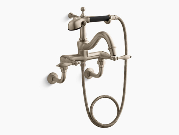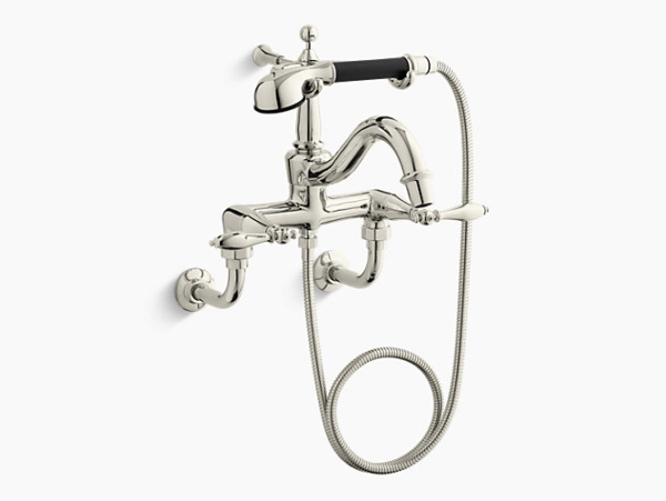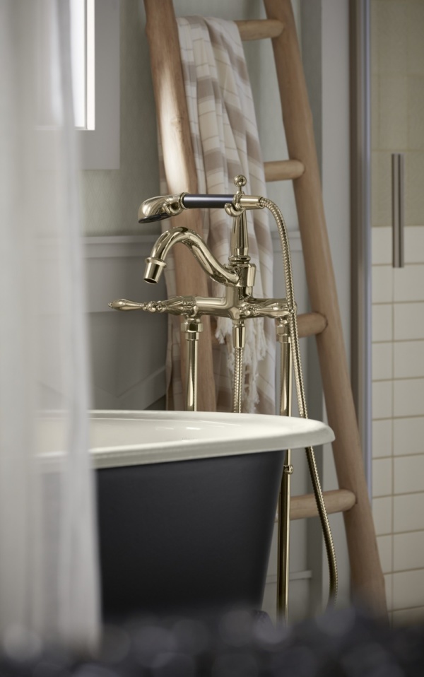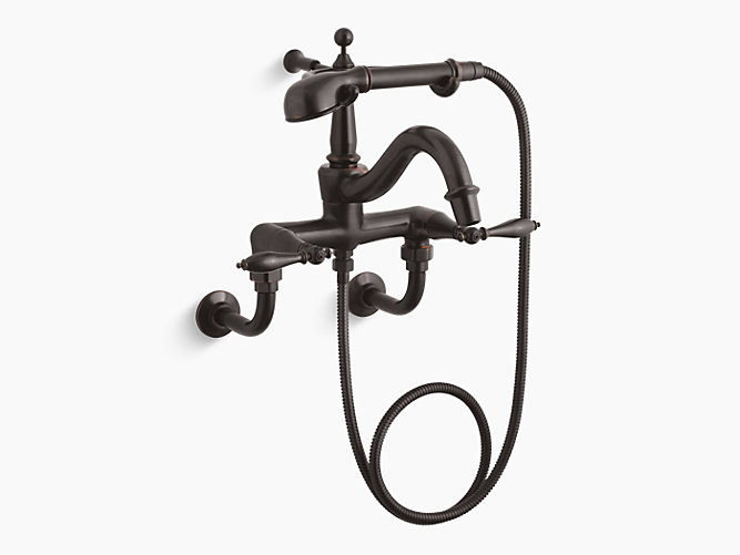 Add elegance to your bath with Finial Traditional faucets and accessories. This traditionally styled bath faucet with handshower brings a vintage touch to your bathroom while offering comfort and convenience. The two-lever design is ergonomic for easy operation. Black accents echo the timeless beauty of Finial bathroom accessories.