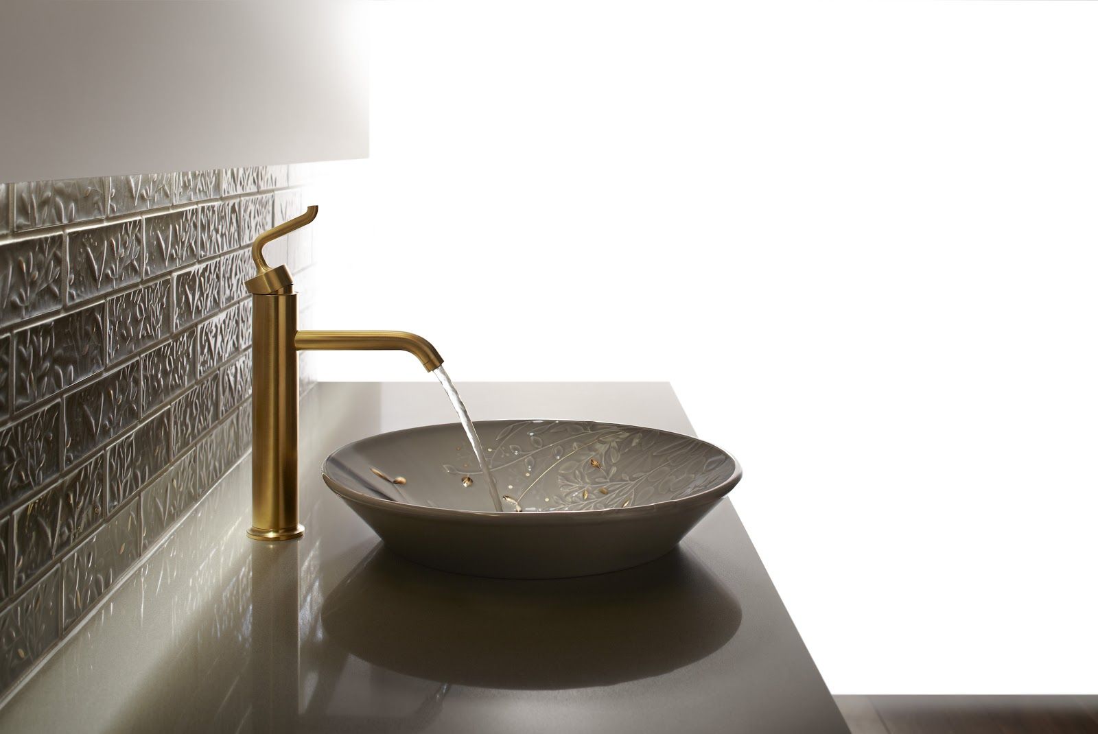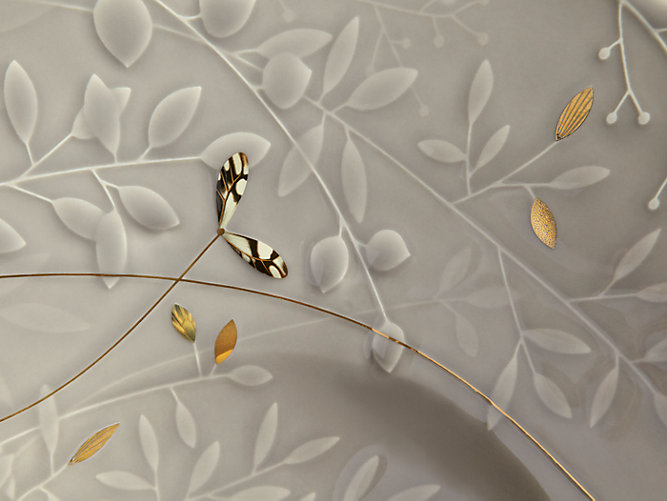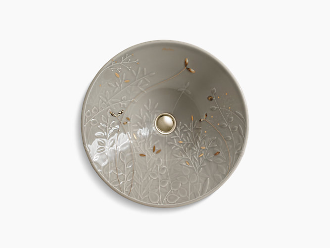 The Conical Bell vessel sink with Gilded Meadow design adds sophisticated beauty to any bath or powder room with its dramatic conical shape and soothing, distinctive design. Inspired by landscape watercolors, the carved floral pattern and precious-metal Gold accents on a Translucent Cashmere background create a textured, harmonious look. Gilded Meadow’s neutral palette seamlessly blends with any decor, making this vessel-style sink an elegant focal point in both traditional and modern spaces.