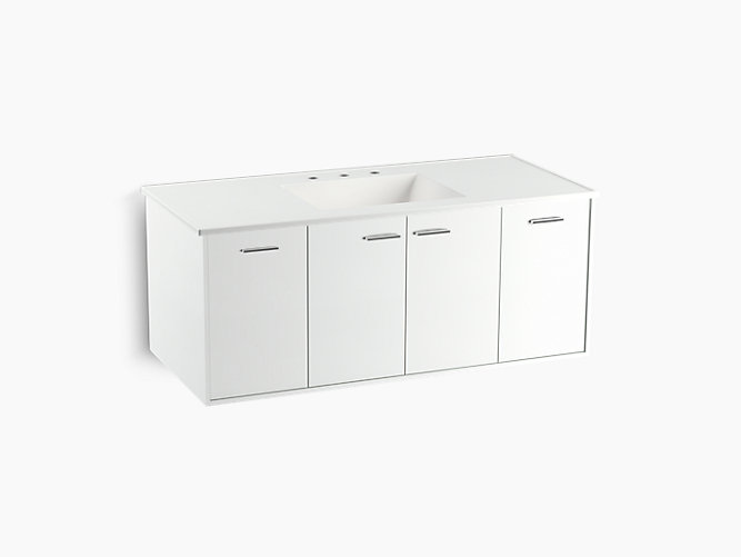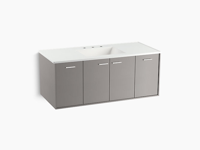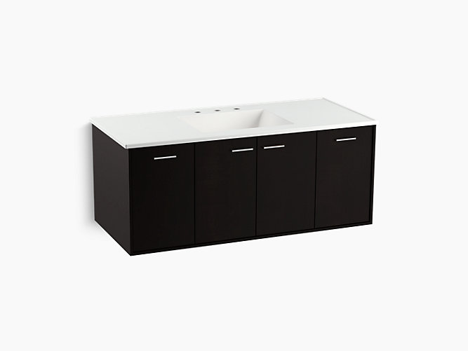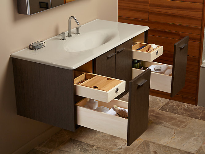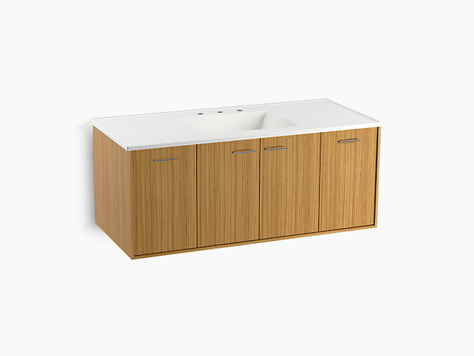 Breathtaking design meets unrivaled craftsmanship in the KOHLER® Tailored vanity collection. No detail was overlooked in the meticulous crafting of this collection, from the premium hardwoods to the specially designed hardware and vanity tops, all available in an array of finishes to create your own look. This Jute bathroom vanity combines the warmth of wood with a sleek wall-hung installation for a fun play on mid-century modern design. Complete your vanity cabinet with a coordinating top, hardware, and accessories from the collection.