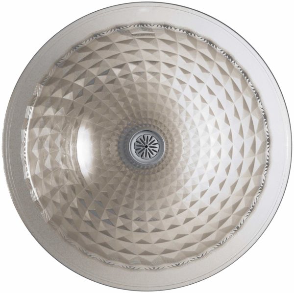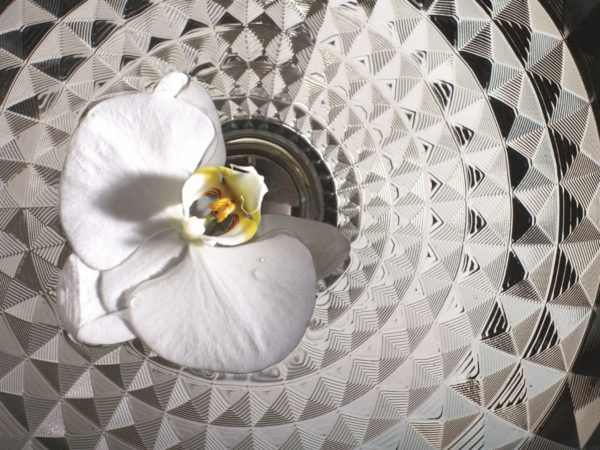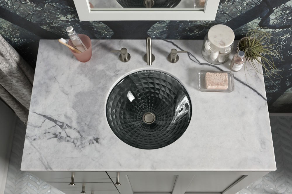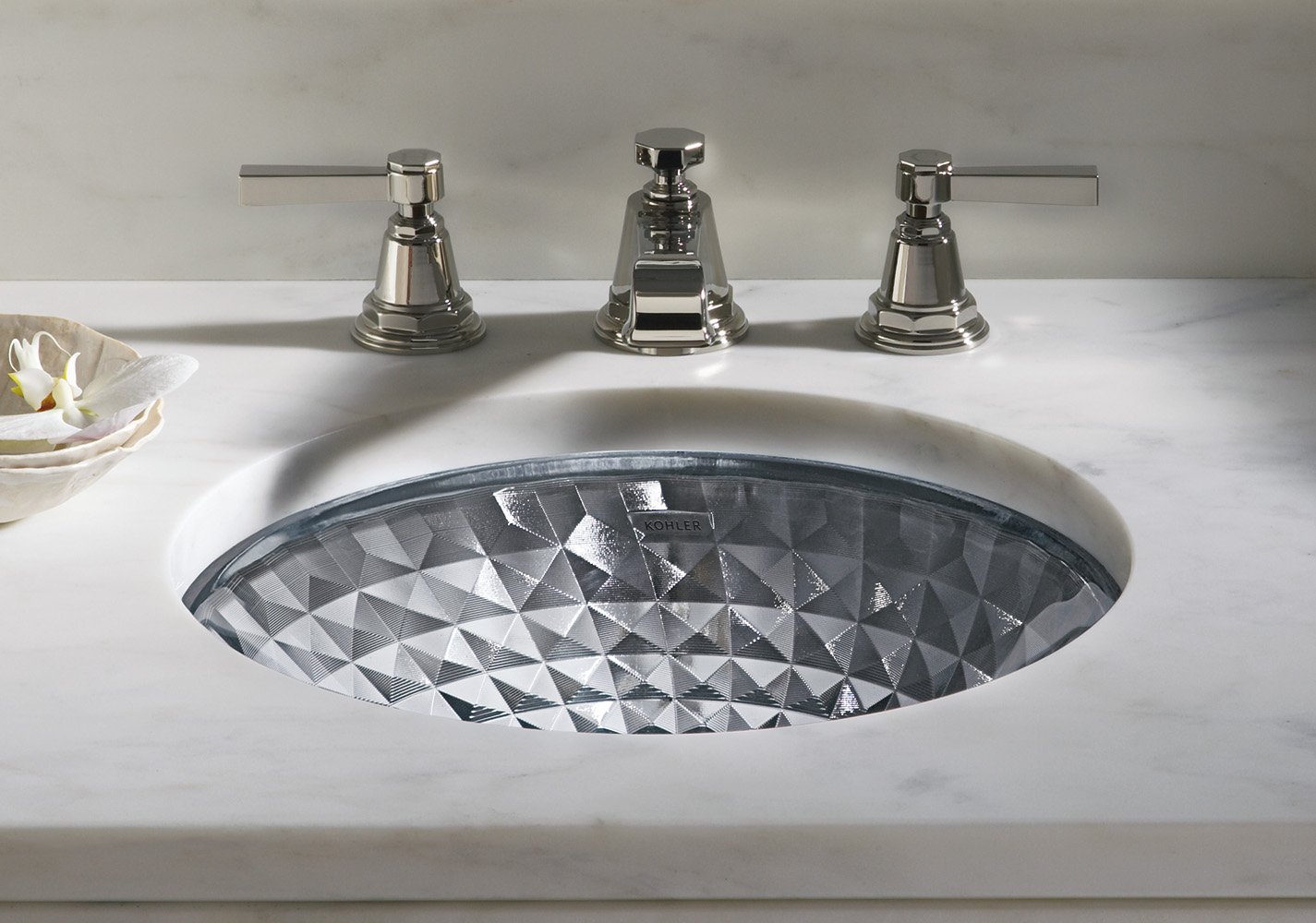 With reflective facets of cut glass, Kallos shines like a jewel in the bath or powder room. Part of the Artist Editions line of bath sinks, the spun-glass under-mount basin offers a distinctive architectural pattern reminiscent of fine crystal. This basin’s design creates stunning visual depth while appropriately concealing the view of toiletries stored inside the vanity.
