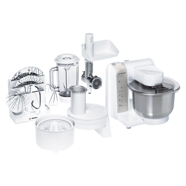 • Great multifunctionality thanks to patisserie set (beating whisk, stirring whisk, kneading hook), continuous shredder with three discs for shredding, grating and cutting, mixing attachment, citrus press, meat mincer — with accessory holder.