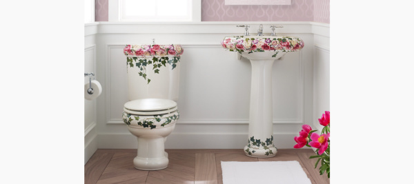 Peonies & Ivy is inspired by the resurgence of traditional Victorian floral imagery in decorating and gardening in America today. Elegant rose, cream, and lavender peony blossoms intertwined with green ivy grace this Revival pedestal sink, bringing the transcendent beauty of a blooming garden to your bathroom.