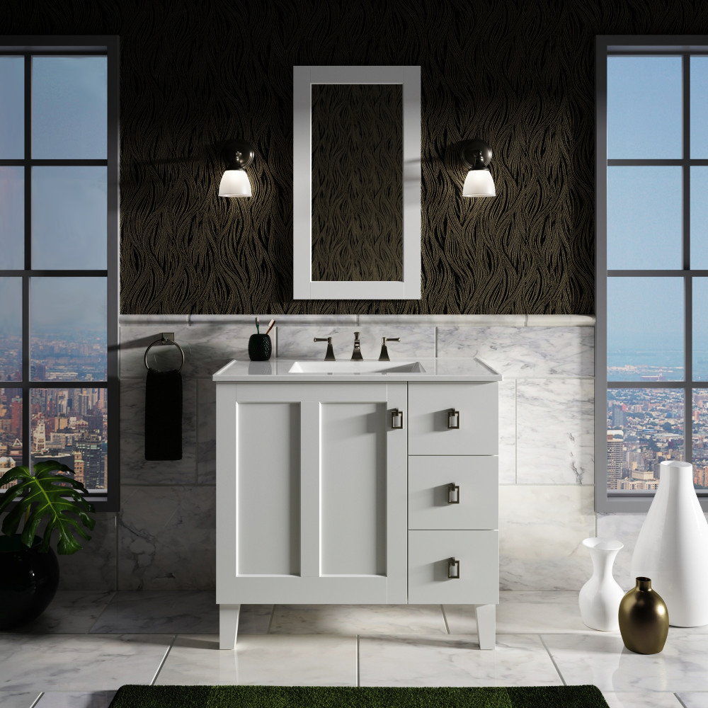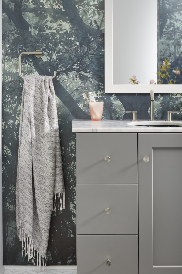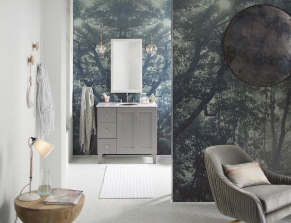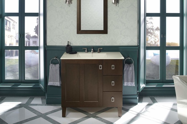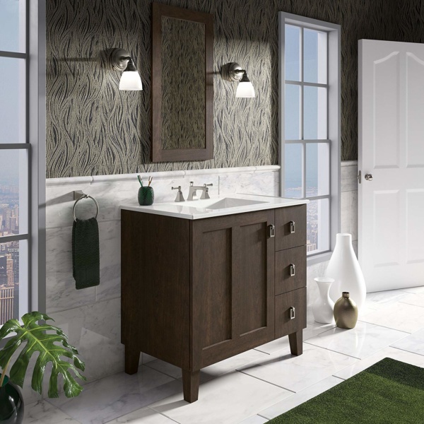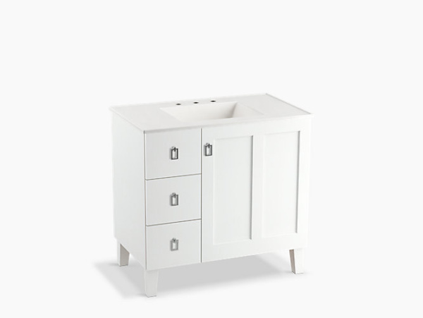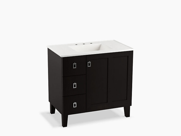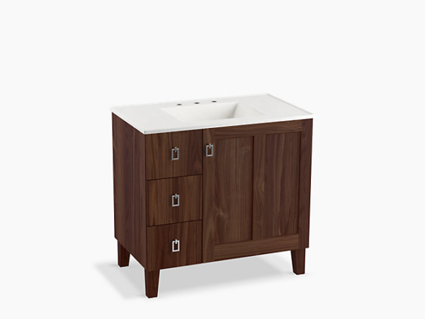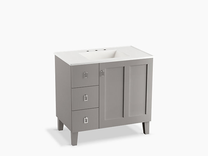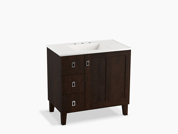 Breathtaking design meets unrivaled craftsmanship in the KOHLER® Tailored vanity collection. No detail was overlooked in the meticulous crafting of this collection, from the premium hardwoods to the specially designed hardware and vanity tops, all available in an array of finishes to create your own look. This Poplin vanity cabinet draws its inspiration from Craftsman and Shaker furniture designs and features a prominent wood grain for a robust, rustic feel. Complete your vanity with a coordinating top, hardware, and accessories from the collection.