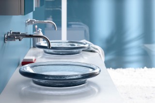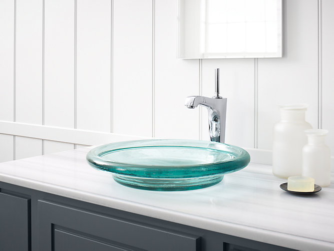 The beauty of the Spun Glass sink lies in its handcrafted appearance and the stunning shape of its basin. The translucent glass offers a versatile look that becomes a focal point in any bath or powder room.