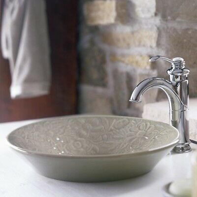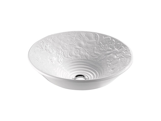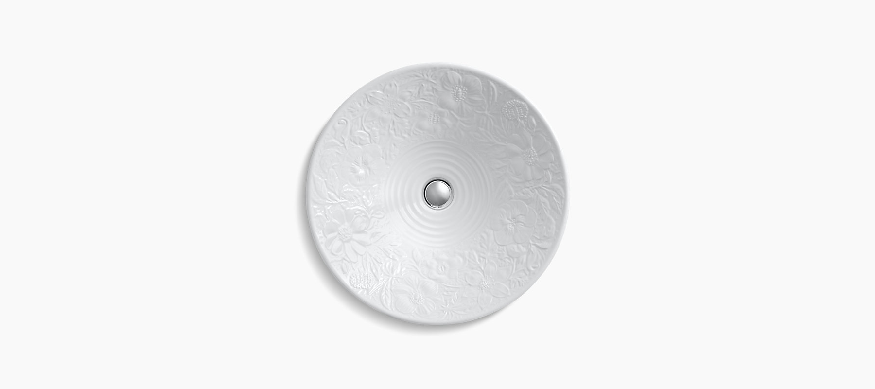 Reminiscent of handcrafted pottery, Water’s Grove features a low-relief floral pattern of clematis, hibiscus, and Lenten roses highlighted by a rich glaze finish. The elegant design graces a Conical Bell vessel sink.