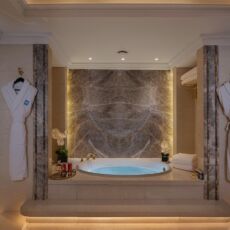 Located in New Administrative Capital, Al Masa Capital is an iconic commercial development, considered to be the major business & destined hub. It contains 14 presidential villas, 60 hotel apartments, and a hotel that includes 90 private suites, 270 rooms and residential spaces, the woodworks and furniture of which are all by Shahed Group. The bathrooms are also all sourced from SHG’s partner brand KOHLER; here in the pictures, we see more notably the Laureate sink in gold and the oval Botanical Study.