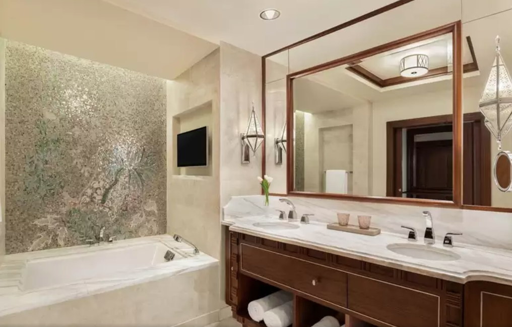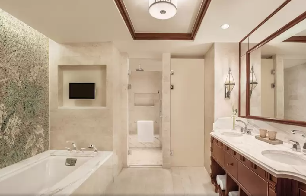 Sculptural forms, smooth surfaces and a classic black-and-white palette keep this streamlined urban bathroom sleek and minimalist, for those who love modern design at its most elemental. A shower with plenty of storage space and a showerhead with a pop-out speaker help make this space as high-functioning as it is striking.